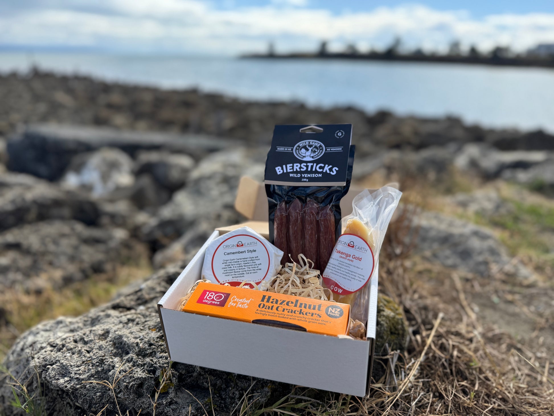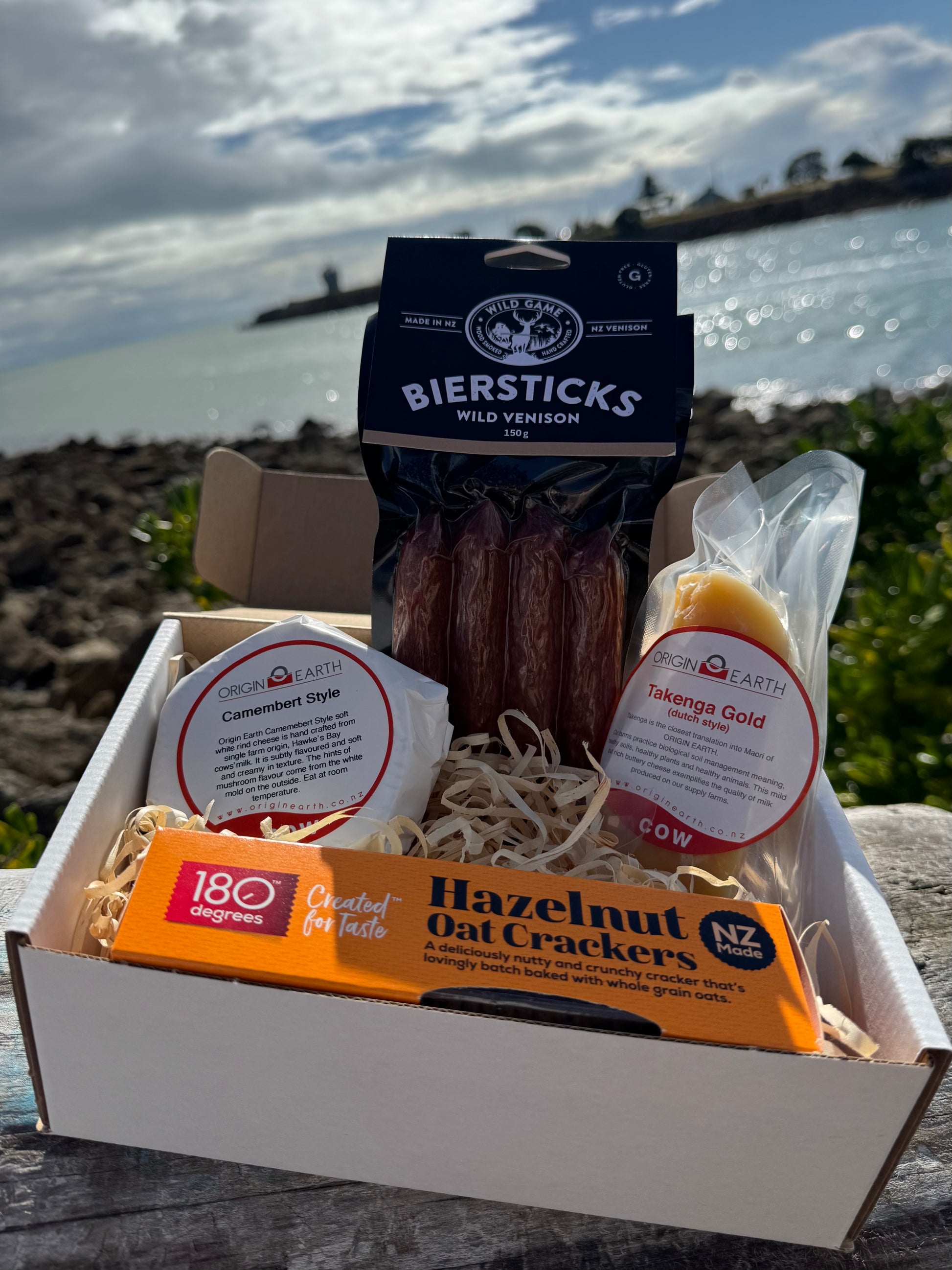 A savory selection of artisanal delights, showcasing the best of Hawke’s Bay. Indulge in Origin Earth's creamy Camembert, Origin Earth's rich Takenga Gold cheese, Wild Game's flavorful wild venison biersticks, and crunchy hazelnut crackers, perfect for any gourmet spread.